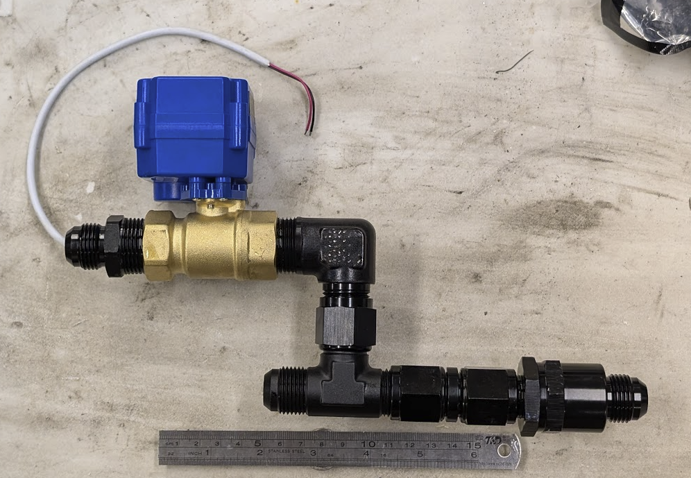 With the accusump in place and an oil cooler already plumbed in, you'll need a way to integrate the Accusump into the system. Enter, the Accusump Charge Manifold (A $1000 name for $60 of parts). The system picture above is actually oriented "backwards" from how I will mount it, but the jist goes that from right to left: Oil enters into a one way valve, connects via a female to female adapter to a T fitting, which has a female connection on time. The top goes up to a 90 degree fitting which is attached to an electric ball valve setup. The electric ball valve goes ontwards to the accusump, and the other end of the T fitting goes onwards to the engine return.