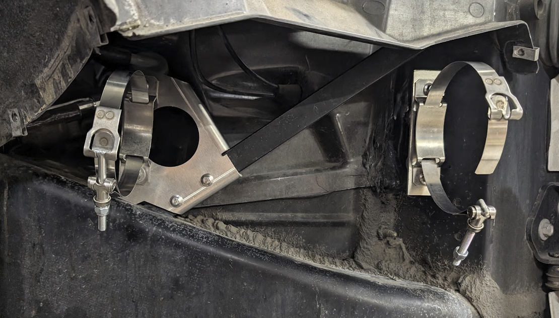 Here is a picture of the final aluminum brackets from SendCutSend in place all designed up and attached along with the band clamps that attach to the actual accusump in place. The left bracket is held in place by 2x M6 rivnuts through that square tubing piece for ease of removal and reinstallation.