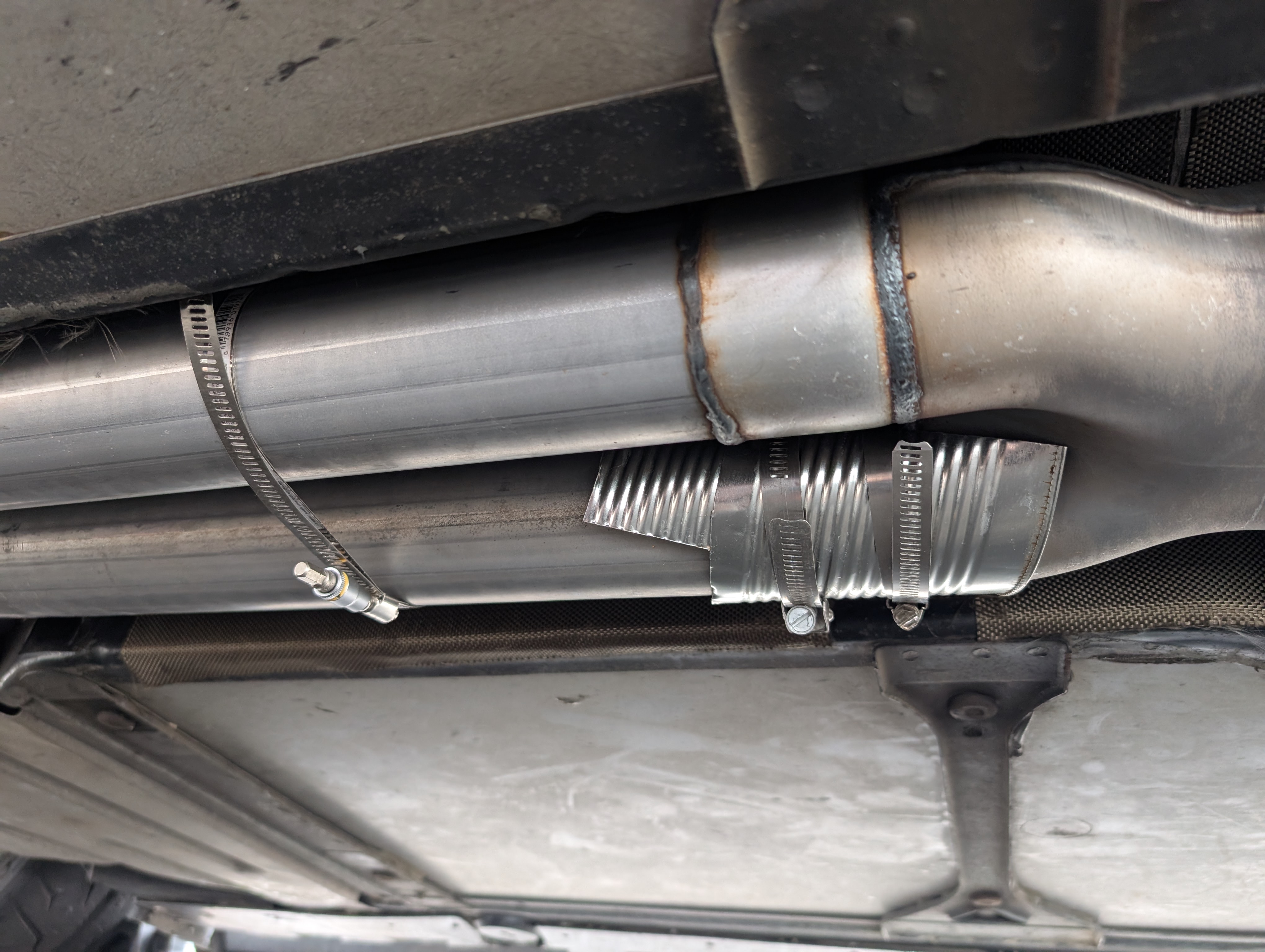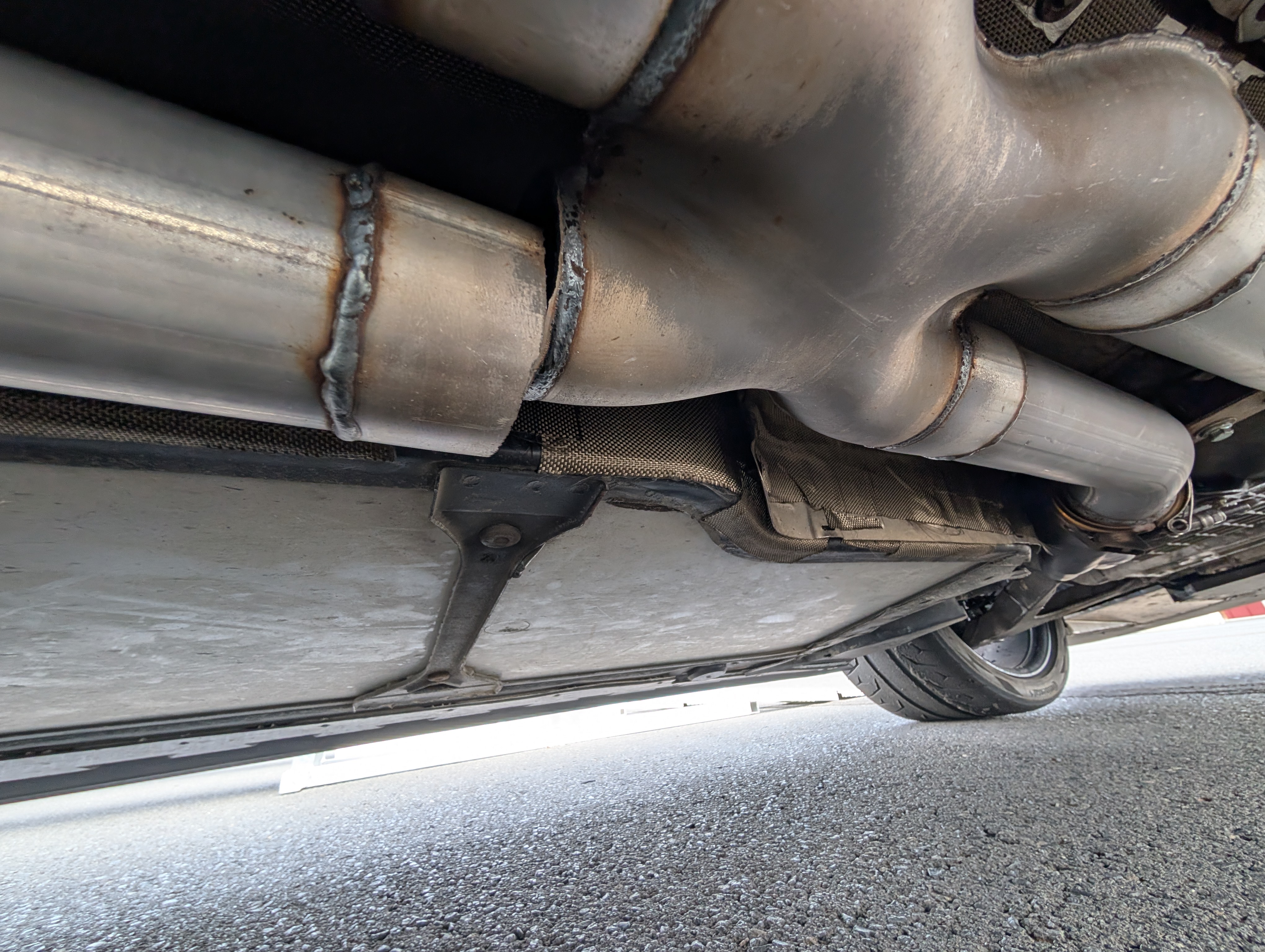 The exhaust snapped in the mid pipe shortly after where the X pipe is. I believe this is because the front of this exhaust is hard affixed to the chassis (you can even see one of the bolts far right) while the remainder of the exhaust is on hangers. That means the exhuast can flex and vibrate towards the end, and essentially acts a a very long lever. Thus it worked it's way back to the end of the lever, which was essentially the X pipe, and it cracked where the metal had been a bit weakend by the welding in the area.