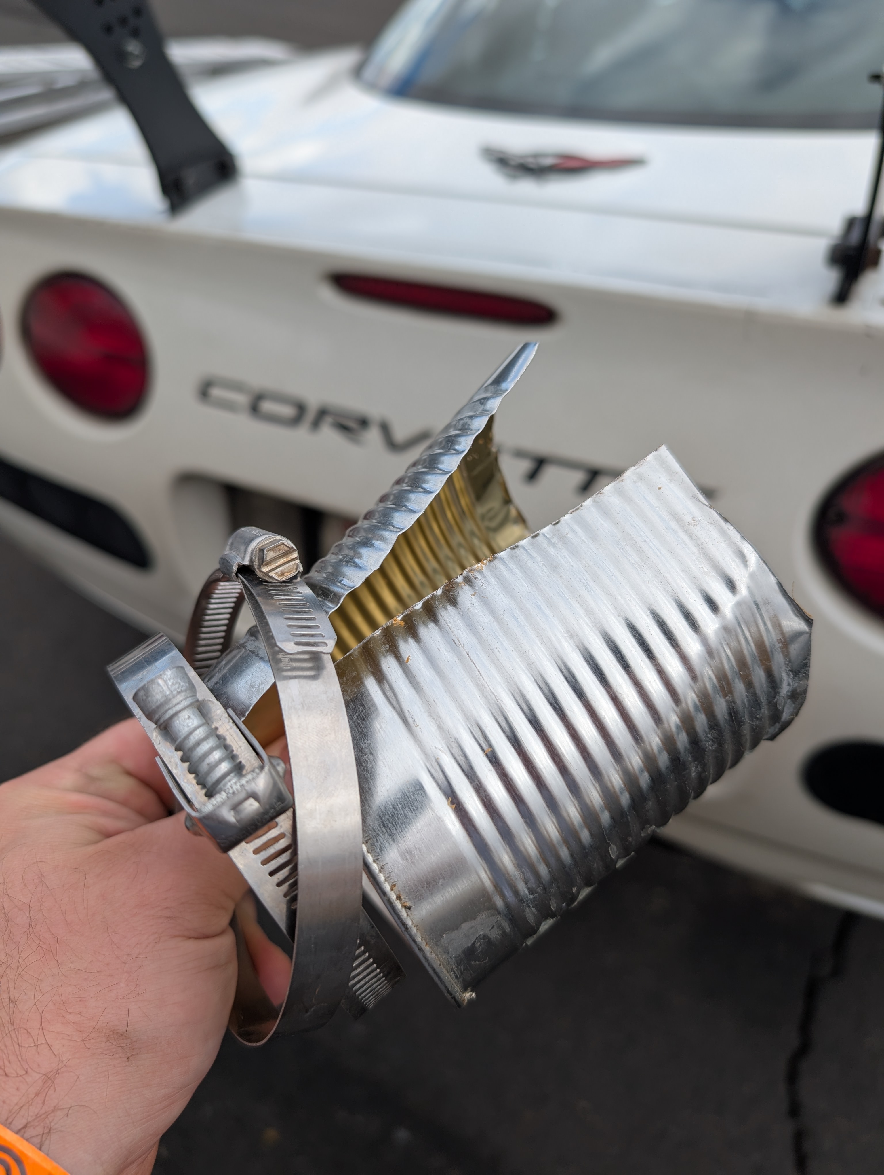 Here you can see the start of the trackside fix we cooked up... a coffee can and some hose clamps to keep it all attached. Award winning? Definitely not. Functional? Perhaps!