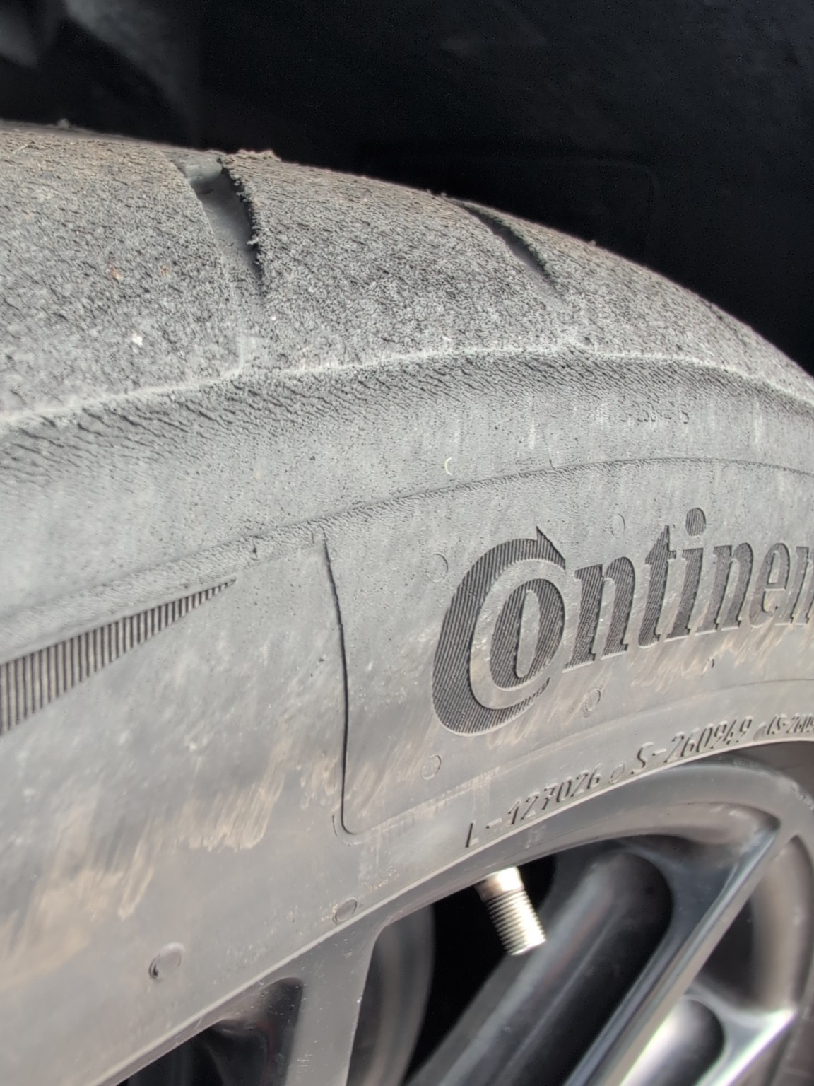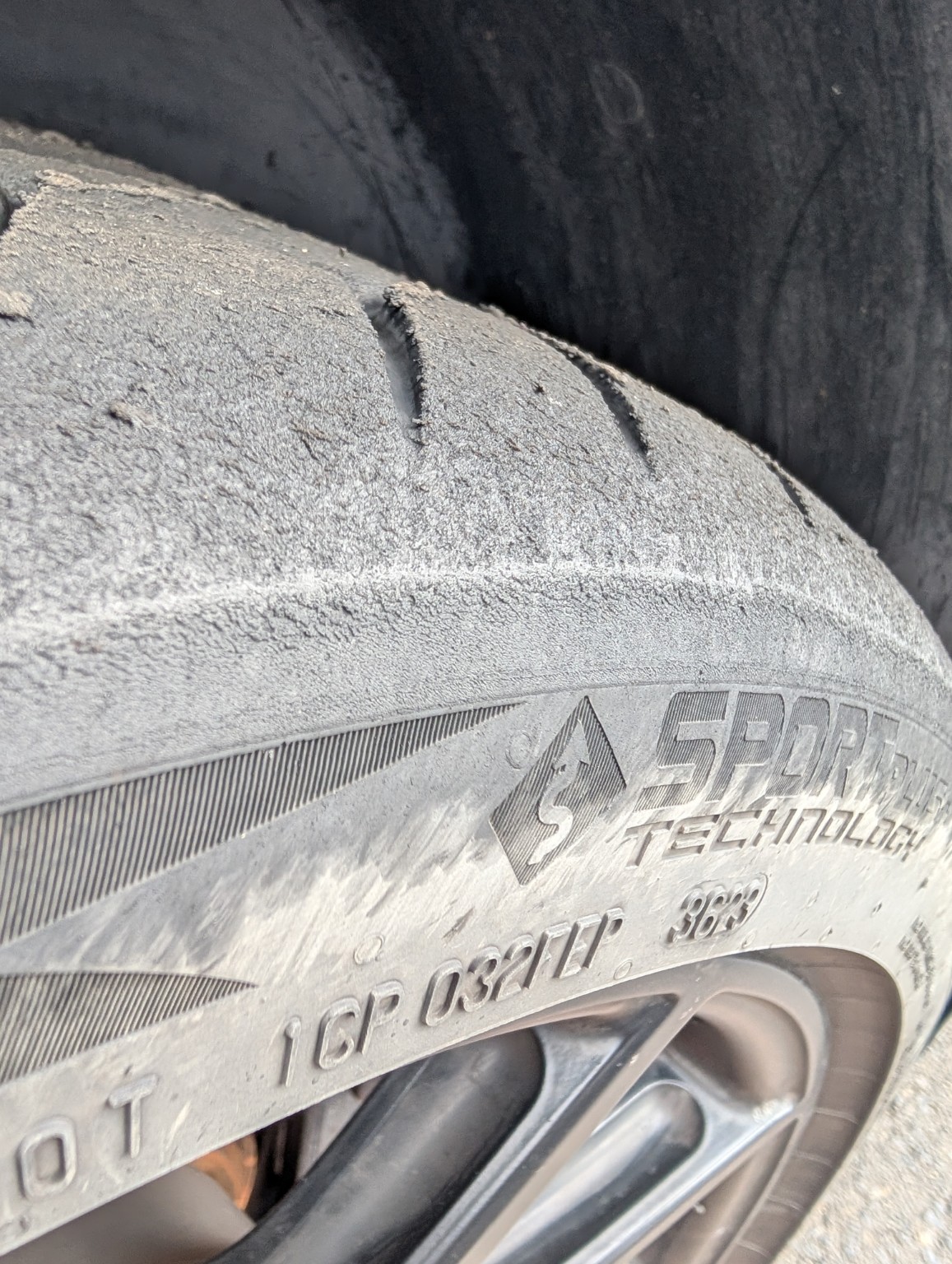 One thing I did different, was I worked with AI and gave it pictures of my tires while discussing my handling woes. In the first picture, you can see there's some diagnol "tearing" along the edge of the tires. This is indicative of the car trying to come around and oversteer. The second tire is after some pressure, suspension and driving style adjustments. The wear pattern on the edge is now much more uniform. So some nice improvements to be had there!