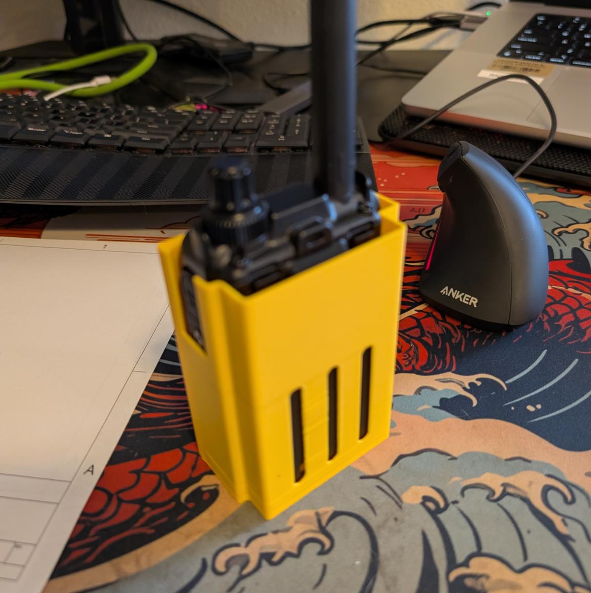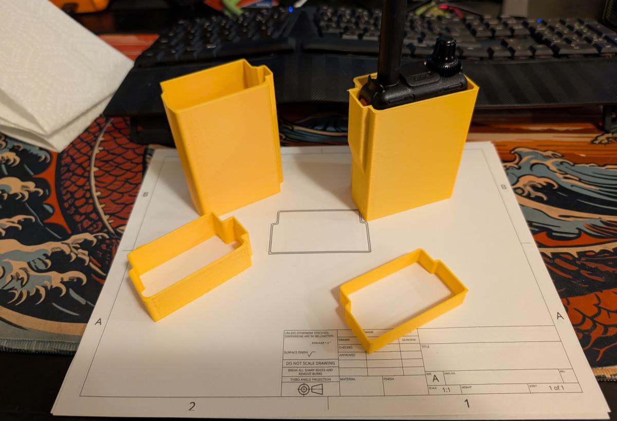 A good handheld radio needs a place to live when you're mobile where it's accessible when you need it but leaves your hands free to do whatever it is that has you mobile in the first place. For driving a cupholder will suffice, but when you're outdoors and active something a bit more serious is needed. For me, I take my Yaesu FT-5DR radio with me skiing in my chest bag where I also come some first aid supplies and an avalanche beacon. While I'm skiing the radio is exposed to all sorts of movement, and if I crash I really don't want to wonder where my radio went. Looking online there were no legitimate holster options for the UV-5R... so It was time to combine my hobbies of CAD and 3d Printing with my Ham hobby!